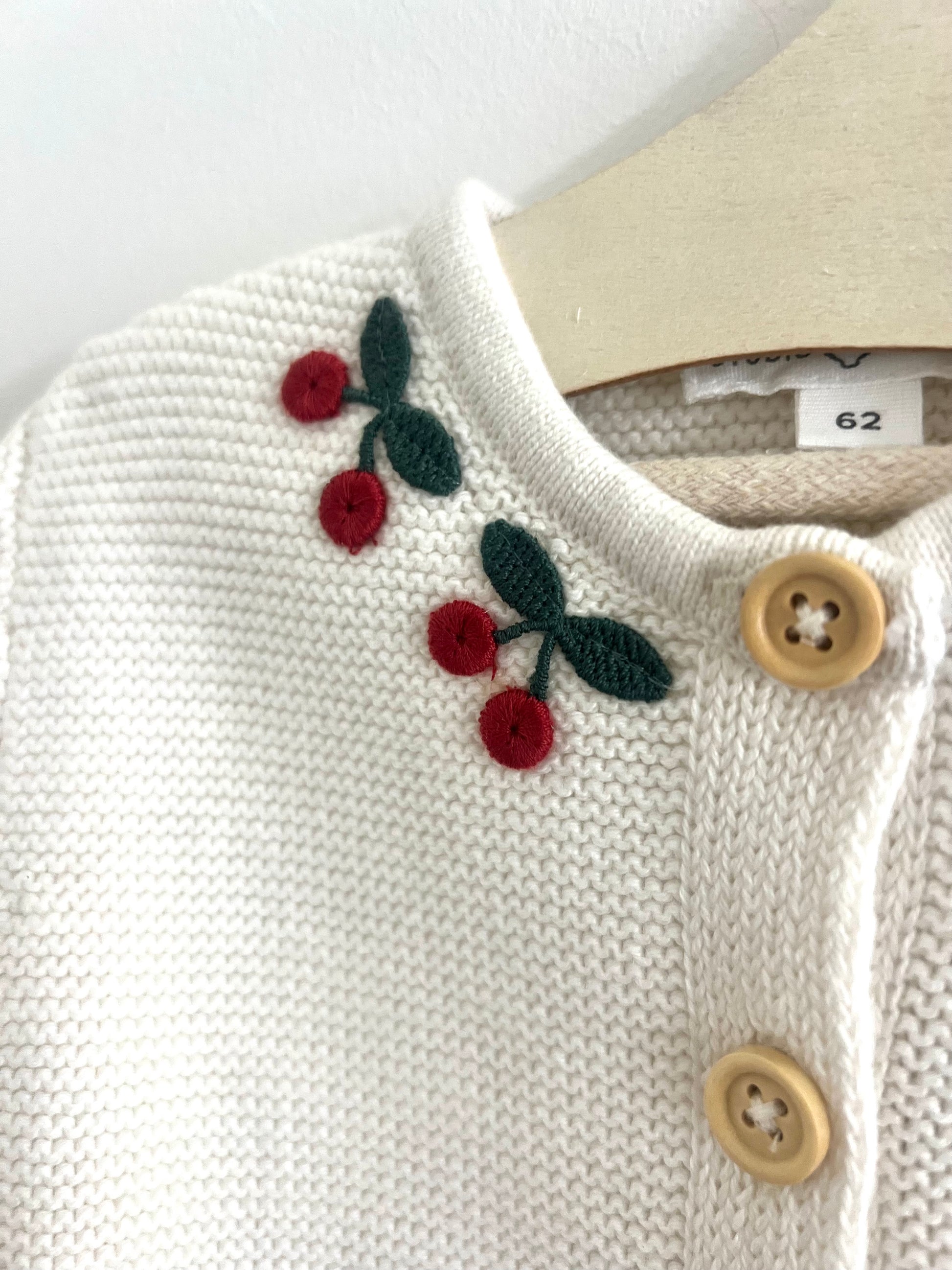 Schattig off-white gebreid babyvestje met kersjes! De houtlook knoopjes geven het vestje een klassieke, maar ook speelse uitstraling. Combineer eenvoudig.
