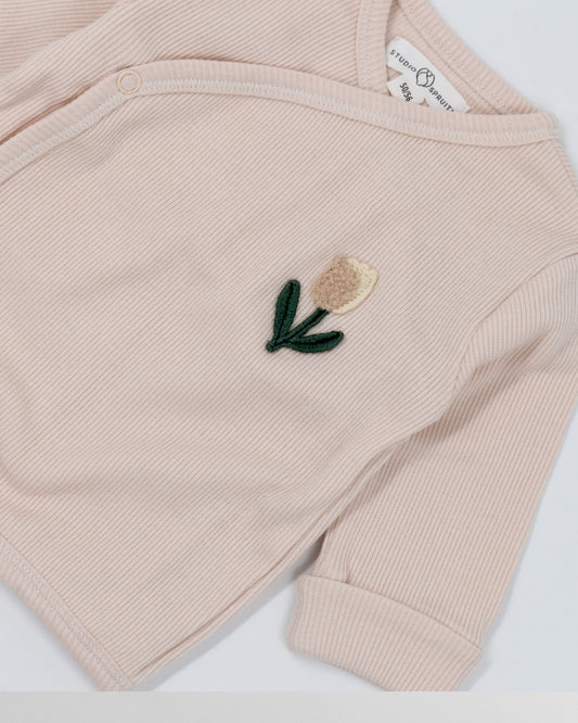 Overslagshirtje rib roze met bloem